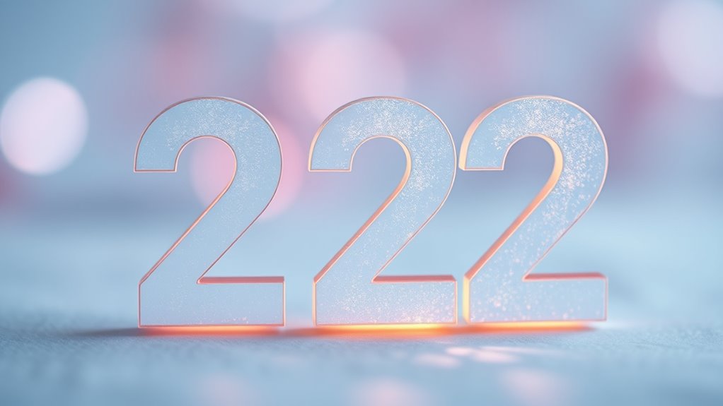 Seeing 222 is like finding a signpost on your path, signaling upcoming life changes. In numerology insights, this number often appears when you’re on the verge of personal growth, urging you to embrace new opportunities. It indicates that shifts are near, guiding you towards harmony and balance. Trust these signals, as they help you navigate evolutions with clarity and confidence, making your journey smoother and more aligned with your true purpose.