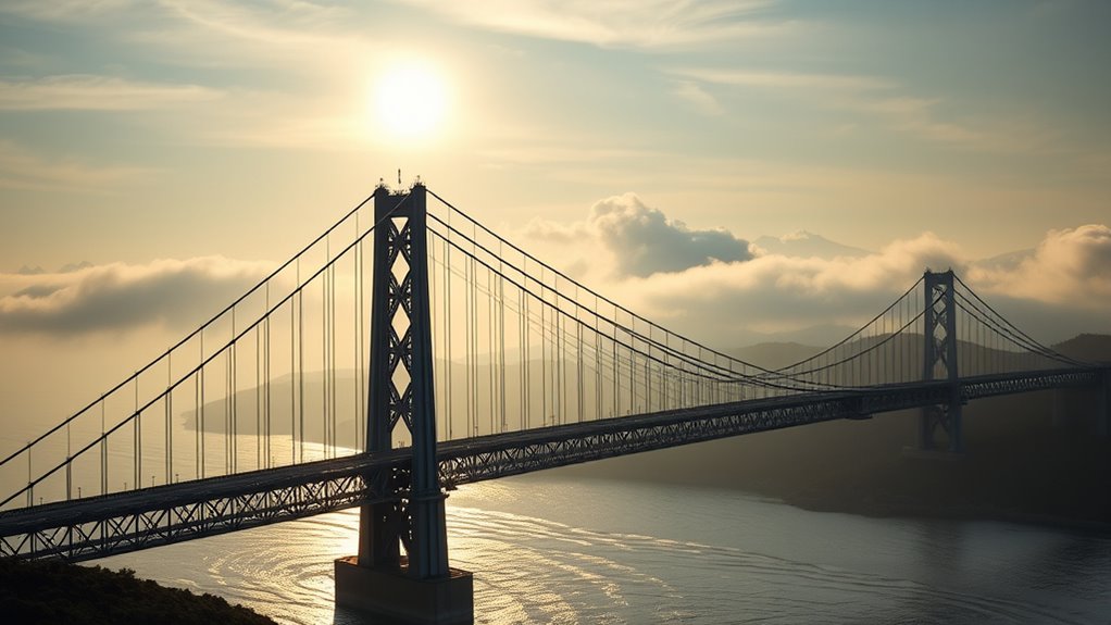 Bridges serve as essential links that facilitate movement and connection between different places, ideas, or phases. They are more than just structures of steel and concrete; they embody cultural symbolism that reflects the values, history, and aspirations of societies. When you look at a bridge, you’re witnessing a physical manifestation of human ingenuity and collective identity. Throughout history, bridges have symbolized unity, progress, and the bridging of divides—whether geographic, social, or ideological. In many cultures, they represent hope and transition, serving as gateways to new opportunities or domains of understanding. This symbolic significance deepens as you consider different cultures’ unique interpretations of bridges, from the ancient Chinese use of the Moon Bridge as a spiritual portal to the Roman arches signifying strength and stability. The architectural evolution of bridges mirrors technological advancements and changing aesthetic priorities. You can trace this evolution from simple, natural materials like wood and stone to modern marvels crafted from steel and reinforced concrete. Early bridges were often utilitarian, built swiftly and with limited resources, yet they laid the groundwork for more intricate designs. As engineering knowledge expanded, so did the complexity of bridge structures — from suspended bridges to cable-stayed and arch designs. Each new development reflects a desire not only for functionality but also for beauty and innovation. When you observe a modern suspension bridge spanning across a wide river or deep valley, you’re witnessing centuries of architectural evolution that combines engineering prowess with artistic expression. These structures often become icons of their cities, symbolizing progress and resilience. The evolution of bridge architecture also showcases technological breakthroughs, such as the use of new materials and construction techniques, enabling you to cross previously insurmountable obstacles. Every new bridge design pushes the boundaries of what’s possible, emphasizing the human drive to connect and transcend limitations. Additionally, the incorporation of natural materials, such as wood and stone, in early bridge designs highlights a harmonious relationship with the environment that many modern structures seek to emulate. Every new bridge design pushes the boundaries of what’s possible, emphasizing the human drive to connect and transcend limitations. As you reflect on these structures, consider how their design influences not just transportation but also cultural perception. Bridges can inspire awe and admiration, fostering a sense of collective achievement. They serve as physical reminders that connection and passage are integral to growth, both personal and societal. Whether standing on a historic stone bridge or gazing at a futuristic suspension span, you’re witnessing the ongoing story of architectural evolution intertwined with cultural symbolism—an enduring proof to our desire to bridge gaps and forge new paths forward.