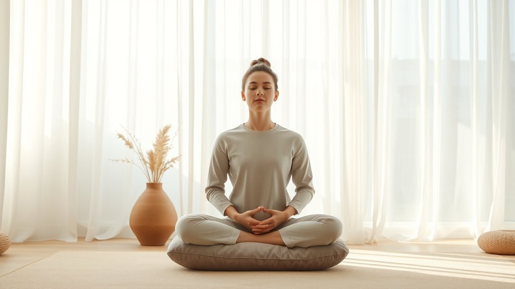 A typical Vipassana retreat lasts about 10 days. During this retreat, you’ll follow a strict schedule overview with early morning meditation sessions, multiple breaks, and evening sittings. You spend most of your time practicing silent meditation, focusing on breath and bodily sensations. The retreat’s duration helps deepen your practice, allowing you to experience insights and mental clarity. Prepare for a disciplined but rewarding journey into self-awareness and inner peace.