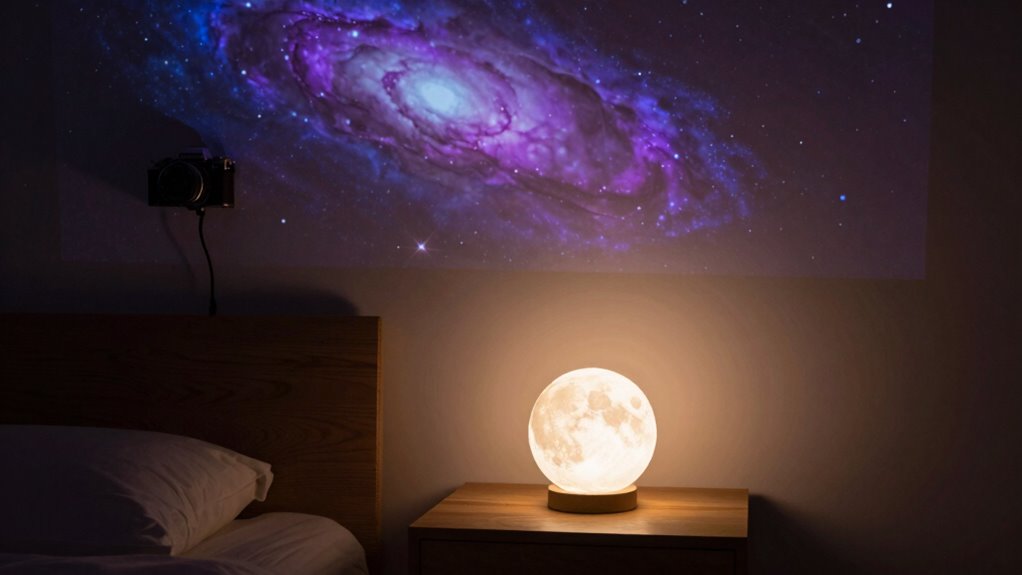 Yes, moon lamps and galaxy projectors are suitable for children’s bedrooms, offering decorative appeal that sparks imagination. However, you should monitor their use carefully, as they can become learning distractions during homework or quiet time. While these devices create calming atmospheres, too much exposure might interfere with focus. Use them in moderation and guarantee they complement, rather than disrupt, your child’s routines.