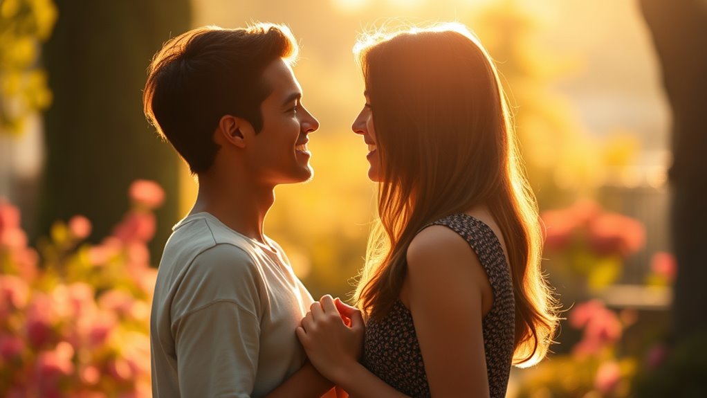 A twin flame friendship and romantic union both stem from a deep soul connection, but they unfold differently. In a friendship, you experience profound emotional intimacy, trust, and growth without physical attraction or expectations of romance. A romantic union adds physical desire and vulnerability, aiming for a life together. If you want to understand how these energies shape your experience and what’s possible, exploring further will reveal more insights.