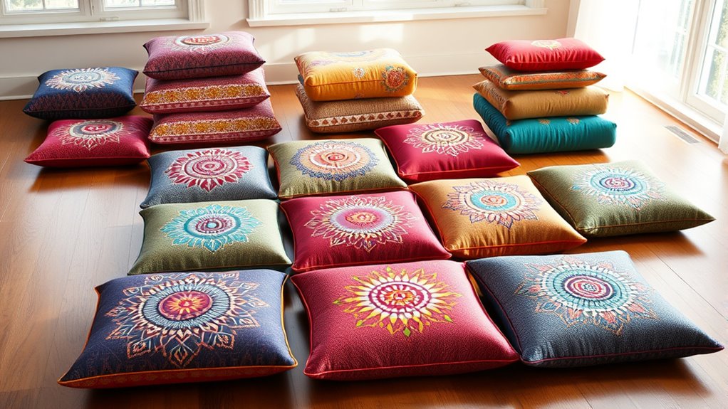 Looking to elevate your meditation practice in 2025? I recommend exploring a variety of high-quality cushion sets that prioritize comfort, support, and style. From traditional Tibetan-inspired designs to modern tufted cushions, these sets offer ergonomic shapes, natural materials, and easy maintenance. Whether you need portability or adjustable firmness, there’s something to suit your space and needs. Keep going to discover the top options that will transform your mindfulness routine.
