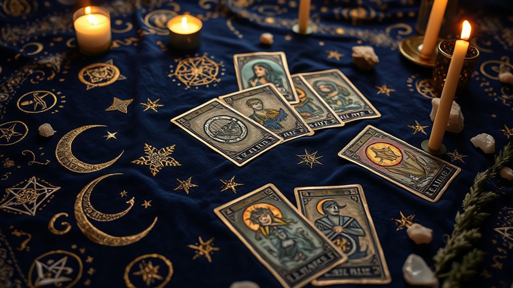 You might be surprised to find that specific altar cloth designs often hold deep symbolic meanings. I’ve noticed how incorporating colors like red for passion or blue for intuition can subtly enhance my reading. Symbols like moons, stars, or mandalas also serve as powerful reminders of spiritual connections. Choosing designs that resonate personally can deepen your ritual experience and invite more focused energy into your tarot practice.